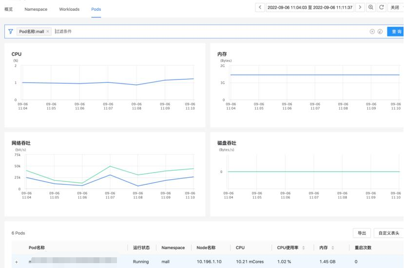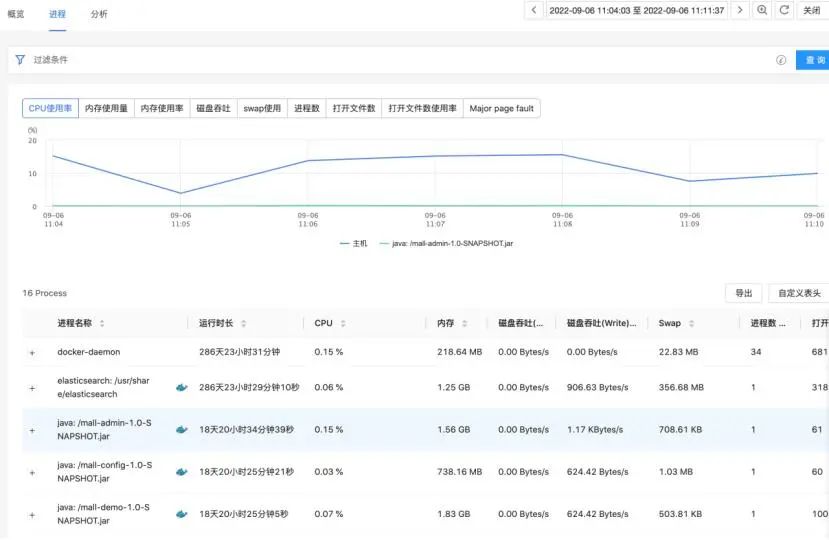 一般來說造成服務(wù)錯誤率升高或者響應(yīng)時間變慢的原因是基礎(chǔ)組件問題導(dǎo),如JVM GC時間過長、CPU利用率過高、內(nèi)存不足、IO延遲過高、網(wǎng)卡帶寬占滿等。確認了服務(wù)問題后還可以進一步下鉆主機、進程、Pod等相關(guān)的指標信息,從而確認故障的根因。