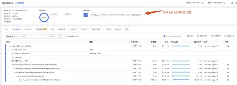 如果確認為服務(wù)端響應(yīng)慢,還可以進行深入的全鏈路追蹤到服務(wù)端,查看調(diào)用鏈路。系統(tǒng)會自動判斷疑似問題。