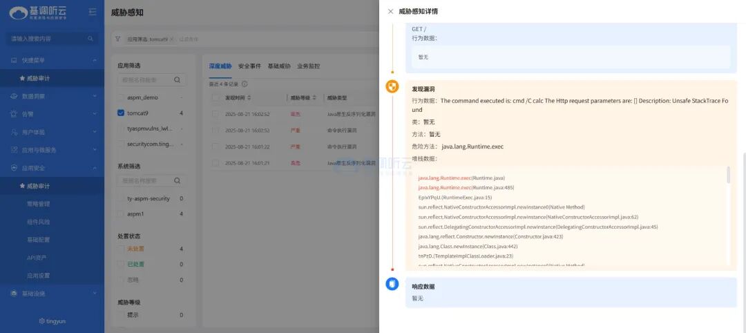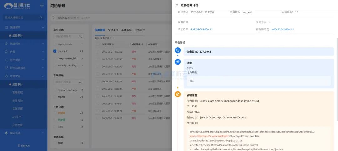 聽云 ASPM 能夠精準識別反序列化漏洞。當 java.net.URL 類被反序列化加載時,ASPM 會立即發(fā)現(xiàn)并展示完整的調用堆棧,幫助安全人員快速定位問題。