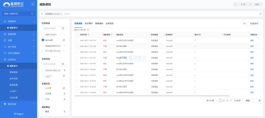 Apache Tomcat 反序列化漏洞(CVE-2025-24813)的曝光,再次凸顯了在當前復雜多變的網(wǎng)絡環(huán)境中,開發(fā)人員定期更新依賴項、檢查安全架構以及部署專業(yè)安全工具的重要性。這一事件不僅是對技術人員的一次警醒,也證明了聽云 ASPM 類型應用安全性能管理工具在 0day 漏洞防護、組件安全等應用安全領域中的不可替代作用。只有持續(xù)關注安全動態(tài),積極采取防護措施,才能在網(wǎng)絡空間中筑牢堅實的防線,確保業(yè)務的持續(xù)穩(wěn)定運行。
