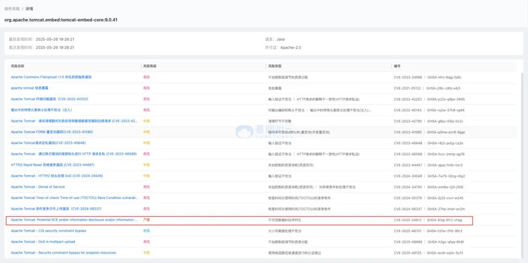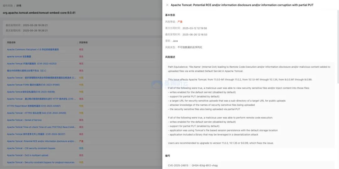 面對日益復雜的網(wǎng)絡安全威脅,專業(yè)的應用安全性能管理(ASPM)工具顯得尤為重要。聽云 ASPM 用戶可以通過威脅感知,組件風險,來實時觀察自己的系統(tǒng)是否存在 0day 安全風險以及 1day 或 nday 的組件風險。針對上述 Tomcat 漏洞,聽云 ASPM 能夠發(fā)揮以下關鍵作用: