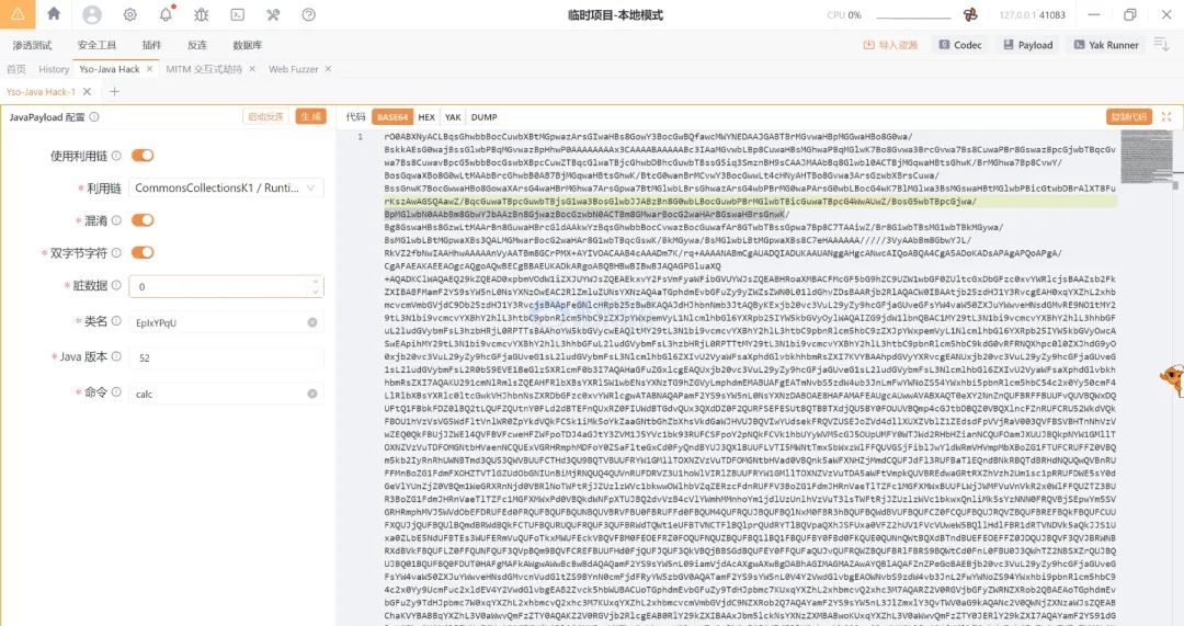 //?3.構造 RCE 鏈(如果有 cc 依賴或其他 RCE 依賴的情況下)通過 yakit 自帶插件 yso-java hack 生成混淆后的反序列化 base64 數(shù)據(jù)