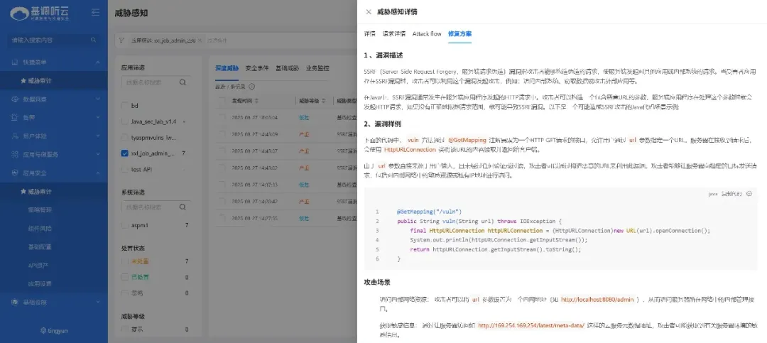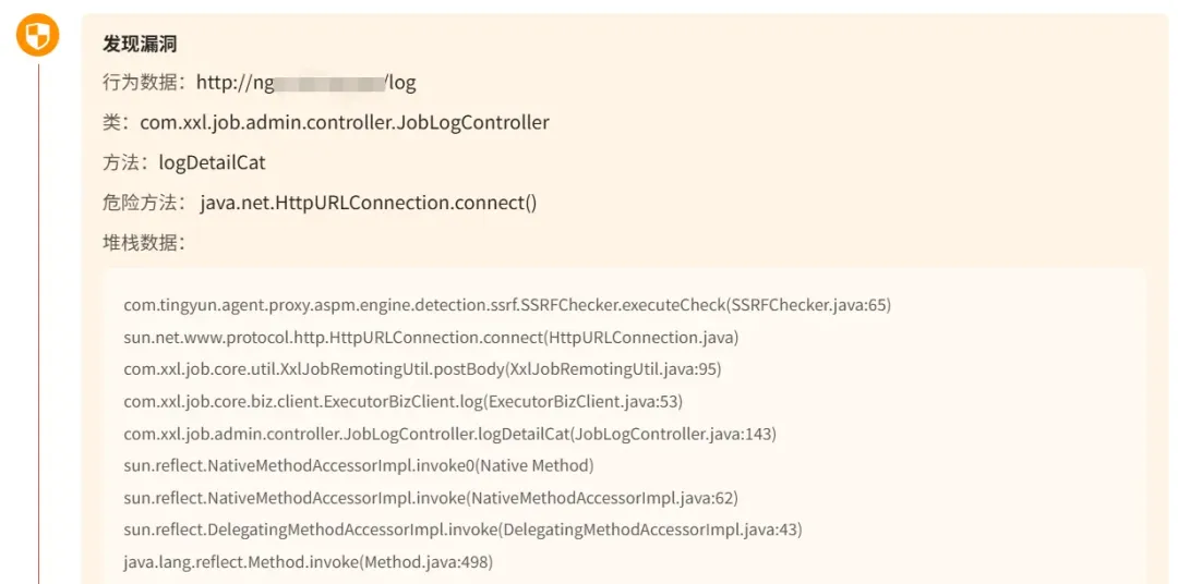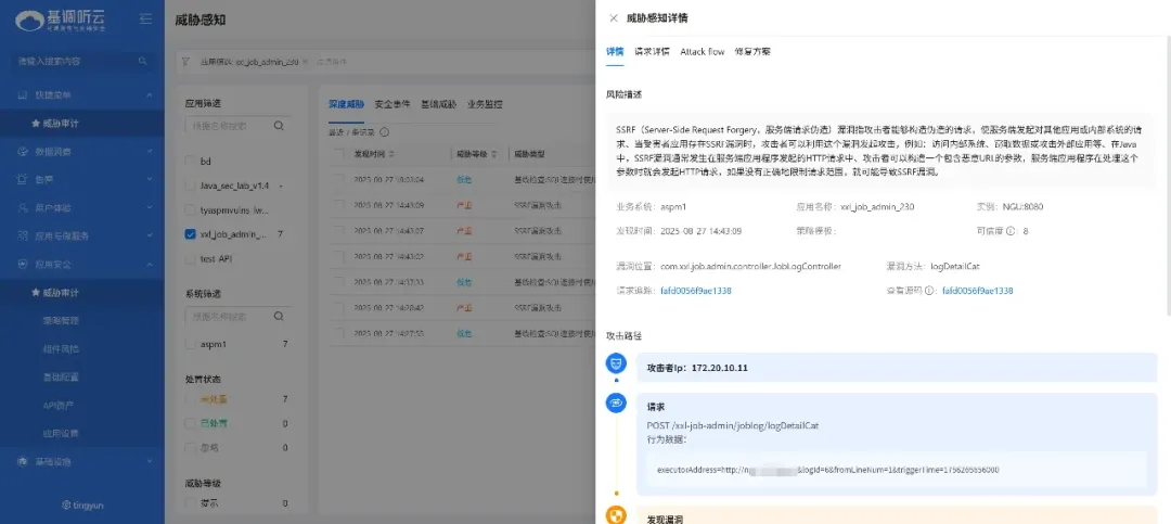 當(dāng) xxl-job-admin 通過(guò)聽云探針插樁后,惡意攻擊者嘗試 SSRF 攻擊,聽云 ASPM 能夠立即發(fā)現(xiàn) SSRF 漏洞。