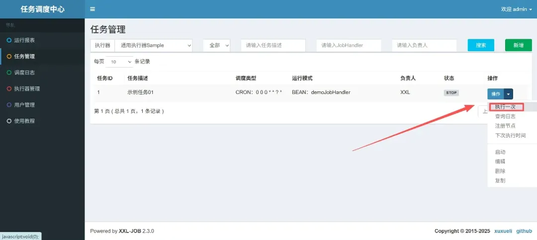 訪問(wèn)http://{hostip}:8080/xxl-job-admin/登錄,然后來(lái)到【任務(wù)管理】,執(zhí)行任務(wù)(確保我們的執(zhí)行器已經(jīng)正確連接到 xxl-job-admin)。