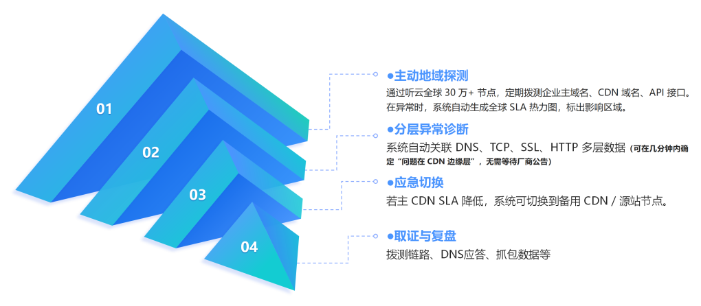 撥測不是替廠商“抓錯(cuò)”,而是替客戶“還原事實(shí)”,當(dāng) CDN 或云服務(wù)宕機(jī)時(shí),聽云 Network 的撥測體系可以幫企業(yè)在幾分鐘內(nèi)回答這四個(gè)關(guān)鍵問題: