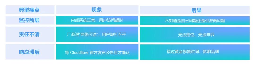 當(dāng)你使用全球 CDN、DNS 或云代理服務(wù)時(shí),你的業(yè)務(wù)健康度已經(jīng)部分掌握在別人手里。當(dāng)?shù)谌骄W(wǎng)絡(luò)層出問題時(shí),客戶最典型的三大困境是:監(jiān)控?cái)鄬樱▋?nèi)部系統(tǒng)正常,用戶訪問超時(shí))、責(zé)任不清(廠商說“網(wǎng)絡(luò)可達(dá)”,用戶卻打不開)、響應(yīng)滯后(等官方公告才確認(rèn))。