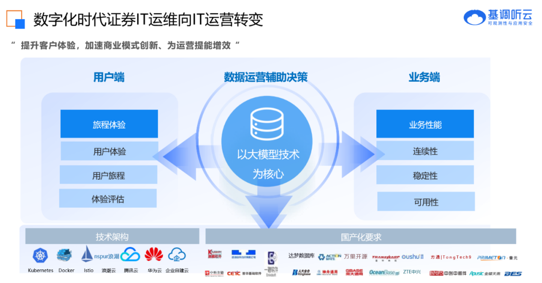 某上市券商接入基調(diào)聽云后,通過業(yè)務(wù)可視化看板實(shí)現(xiàn)交易全鏈路透明化,異常交易識(shí)別速度從小時(shí)級(jí)壓縮至分鐘級(jí);結(jié)合 AI 大模型的智能告警降噪功能,運(yùn)維團(tuán)隊(duì)日均處理告警量減少?75%,真正實(shí)現(xiàn)“讓數(shù)據(jù)說話,用智能決策”。這些成果印證了公司產(chǎn)品在保障業(yè)務(wù)連續(xù)性、釋放運(yùn)維效能上的硬核實(shí)力。