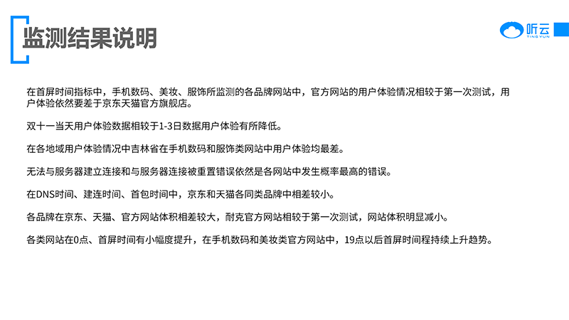 雙十一期間,各電商網(wǎng)站及各大服裝手機(jī)美妝品牌紛紛拿出誘人的折扣,在各電商平臺都能看到他們的影子,各品牌在不同電商平臺及自身網(wǎng)站用戶體驗(yàn)如何,通過聽云Network真實(shí)用戶節(jié)點(diǎn),對各品牌官方網(wǎng)站和京東天貓官方旗艦店用戶體驗(yàn)數(shù)據(jù)進(jìn)行對比分析,來看一看各網(wǎng)站用戶體驗(yàn)情況。
