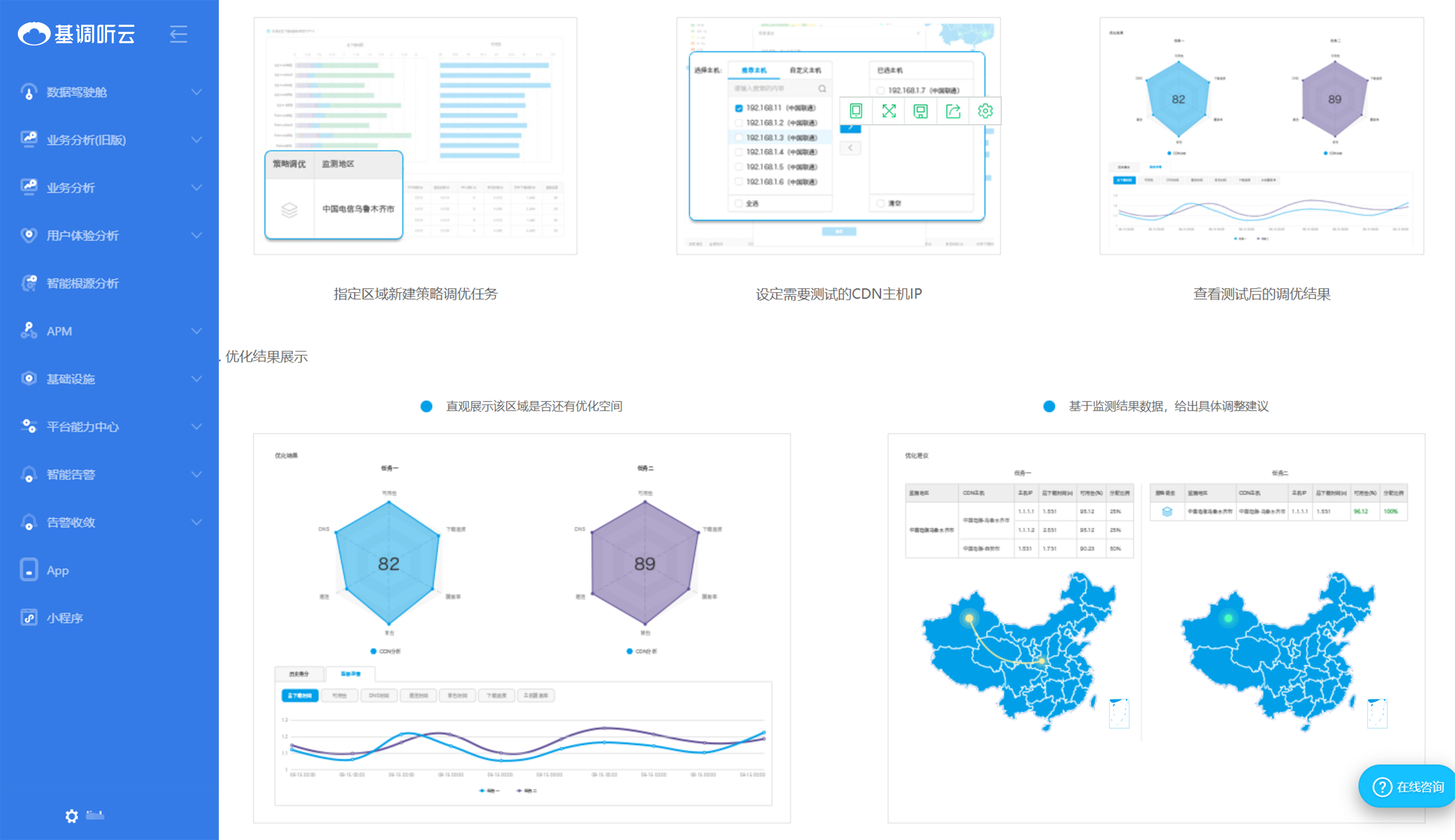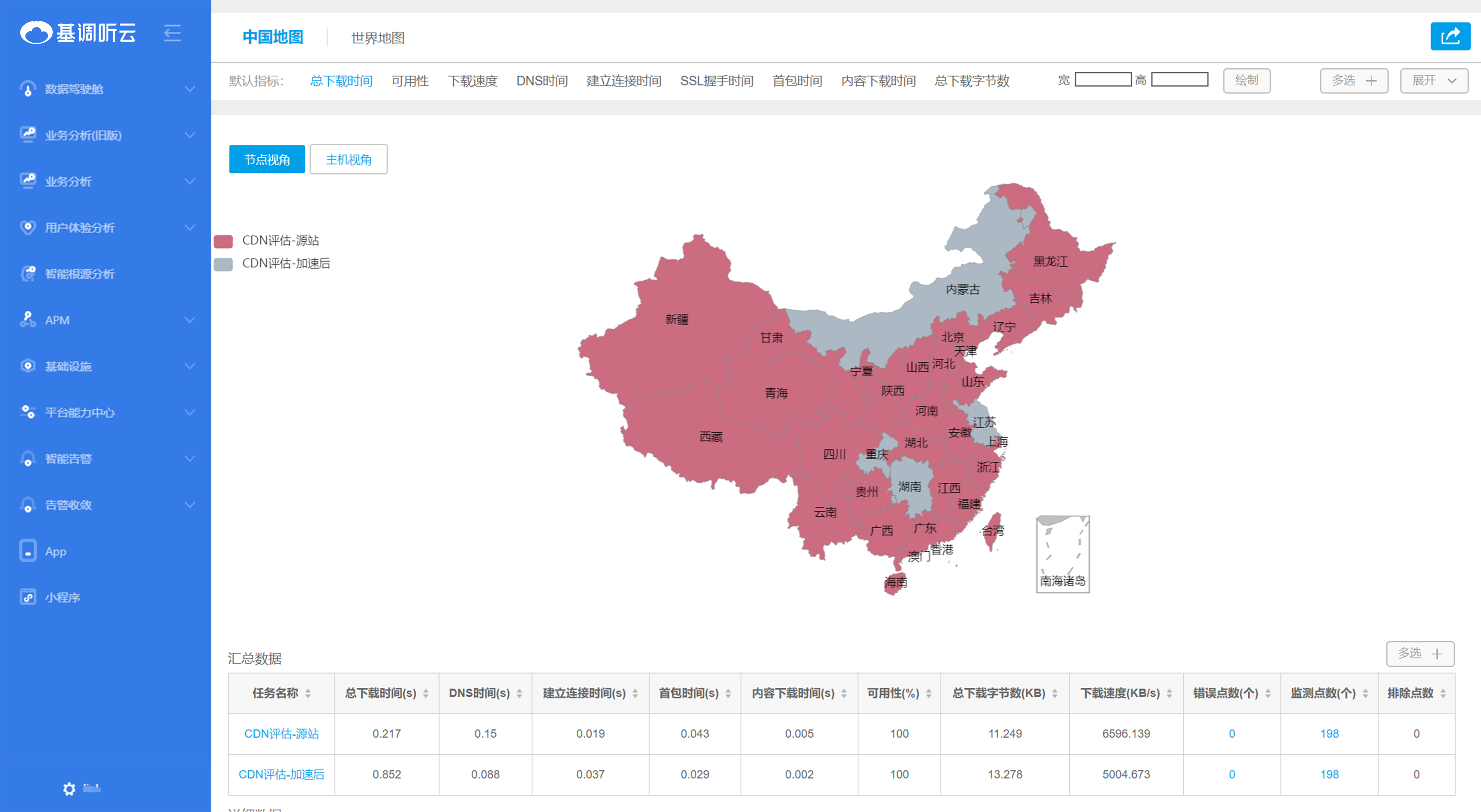 基調(diào)聽云通過模擬用戶訪問方式,提供用于CDN質(zhì)量監(jiān)控、CDN加速效果評估、CDN節(jié)點質(zhì)量評估,CDN選型優(yōu)化等場景下完整的第三方解決方案,讓CDN質(zhì)量不再是黑盒子。