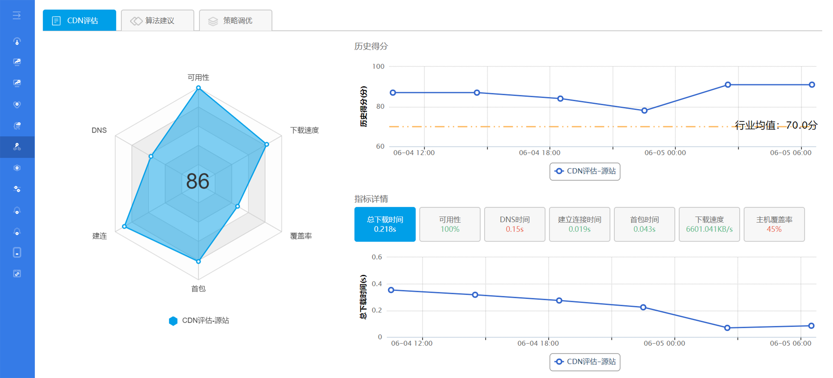 通過分析CDN主機的質(zhì)量,包括:性能、可用性、主機覆蓋率等指標,對廠商的CDN性能數(shù)據(jù)進行客觀展示,也可為客戶提供測試報告,便于客戶進行CDN質(zhì)量評估。