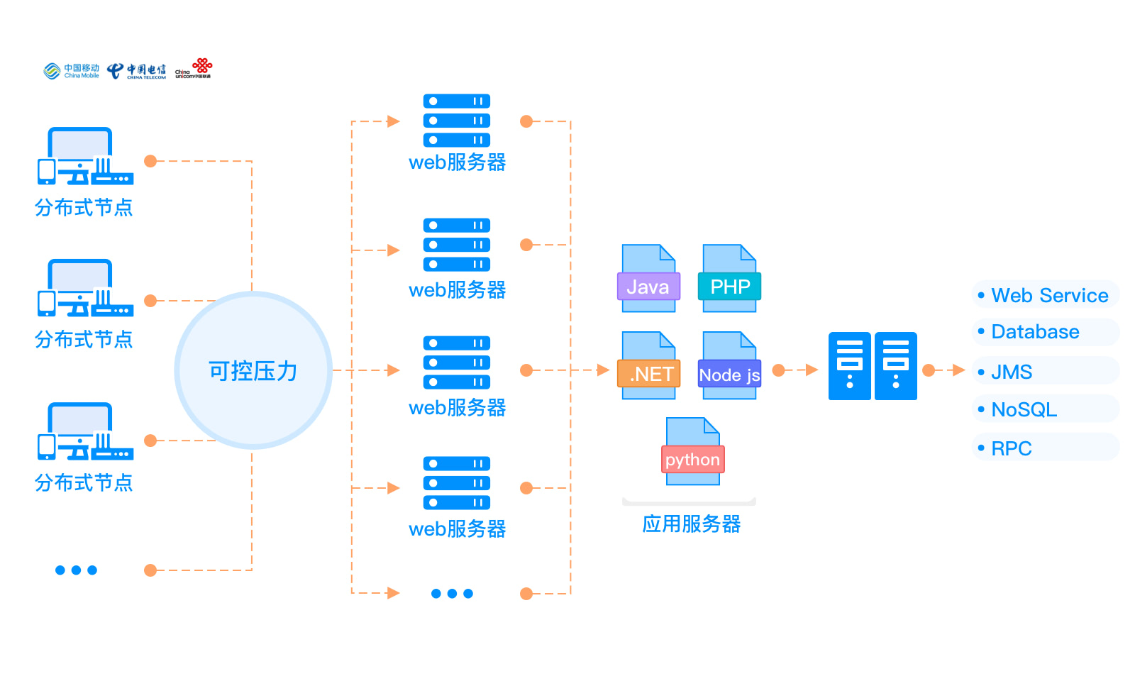 支持SaaS節(jié)點(diǎn)或私有化節(jié)點(diǎn)(純軟件或軟硬一體設(shè)備)同步運(yùn)行測試,并提供基于JMeter腳本、瀏覽器事務(wù)的分布式單一類型或混合類型壓力。
