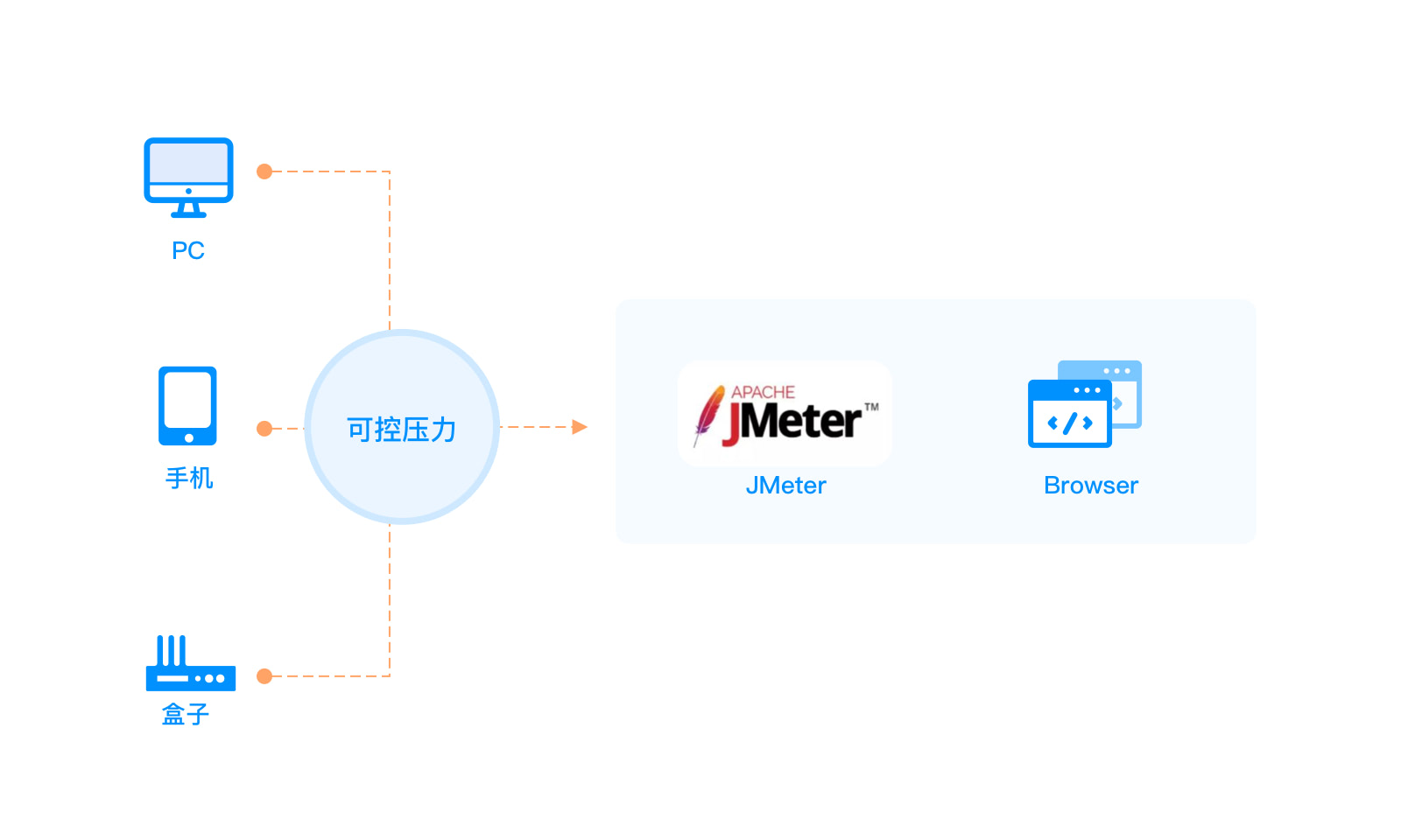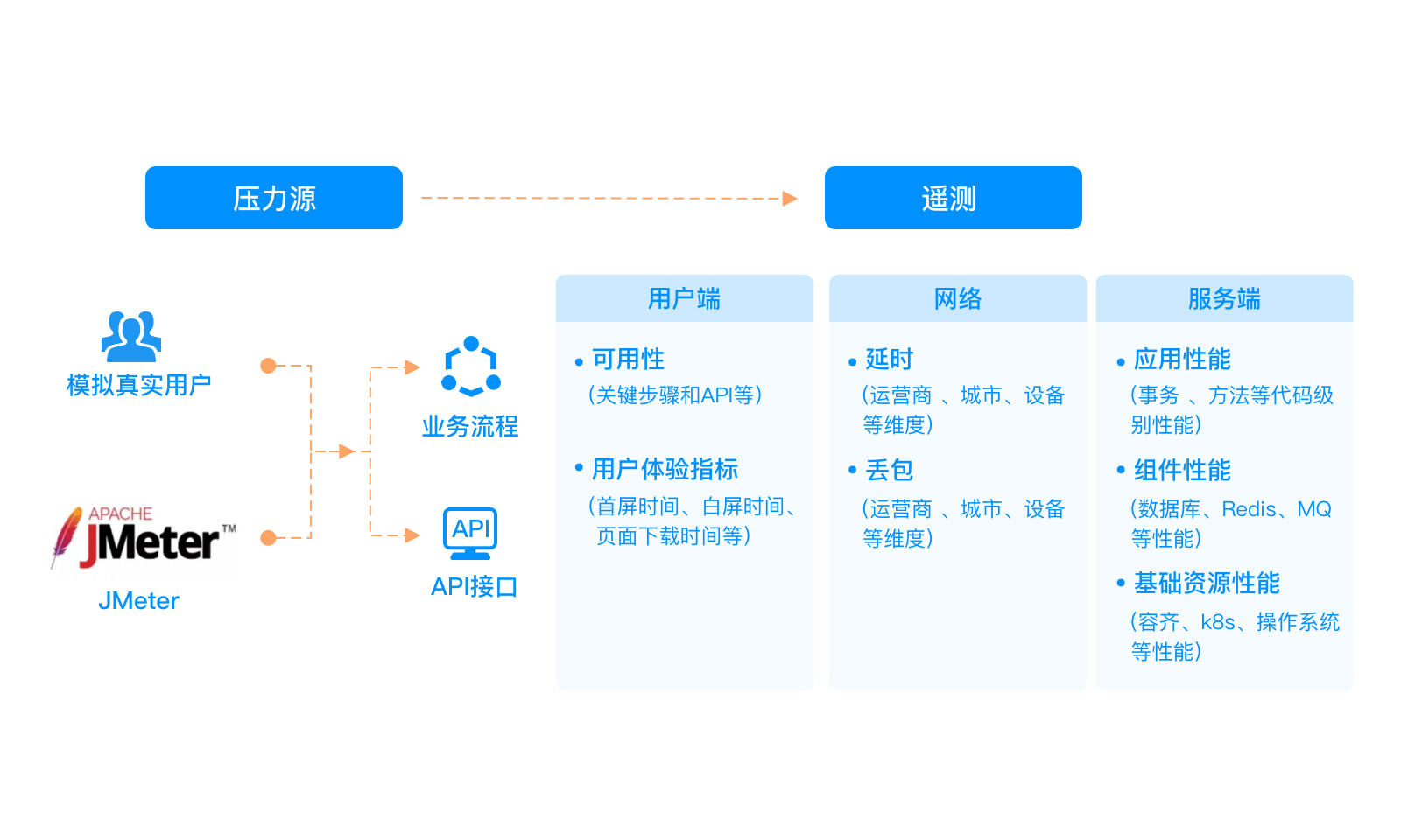 基調(diào)聽云全鏈路混合壓測提供JMeter+Browser方式的壓力源,并結(jié)合應(yīng)用性能監(jiān)控、用戶體驗(yàn)監(jiān)控、基礎(chǔ)資源監(jiān)控形成具備可觀測性的全鏈路混合壓測方案,幫助進(jìn)行容量保障。