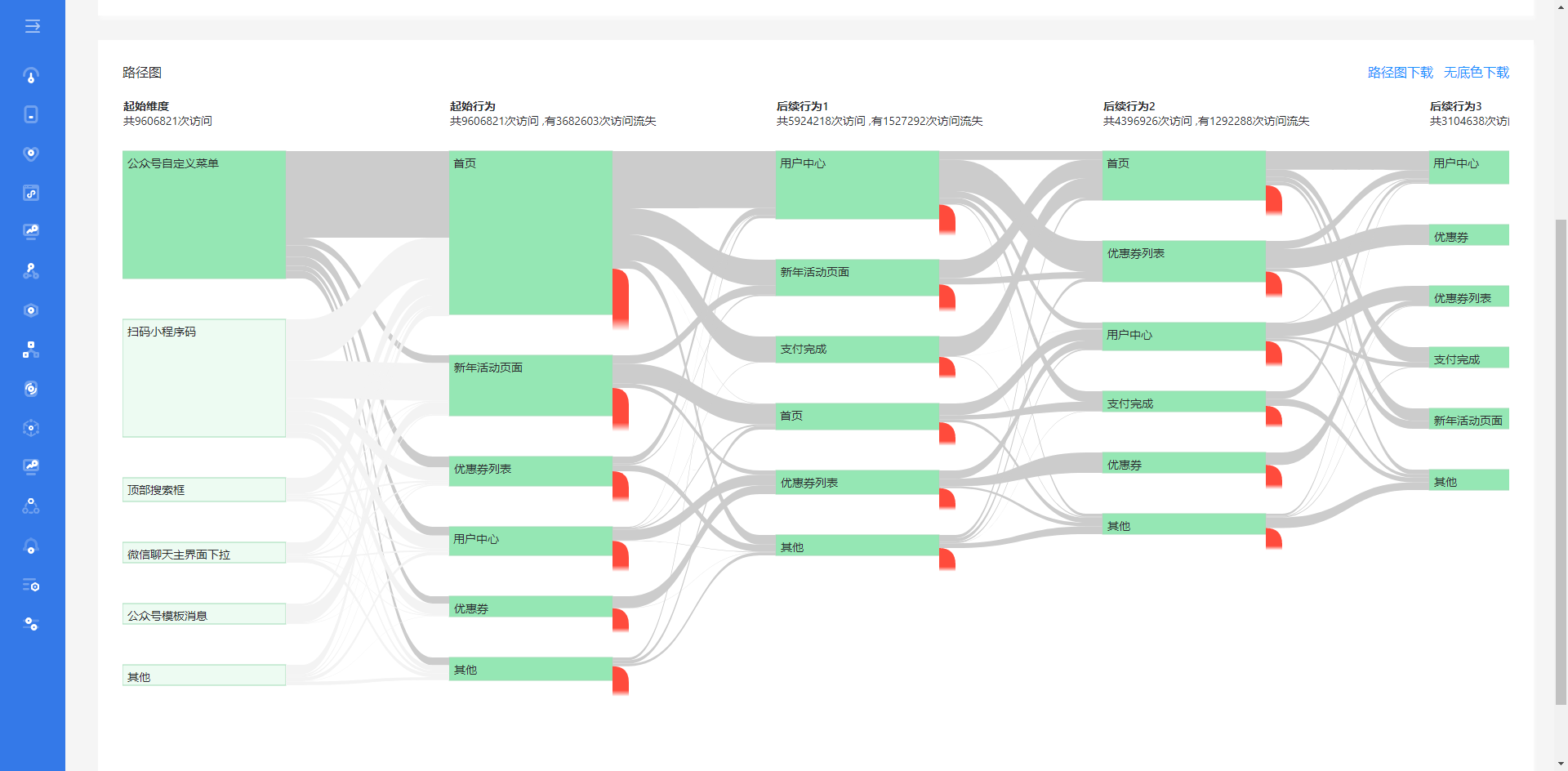 對全部流量來源、入口頁面和關(guān)鍵路徑等信息進(jìn)行有效匯總,結(jié)合性能監(jiān)控指標(biāo),綜合分析用戶體驗(yàn)差導(dǎo)致用戶流失問題,以便提升用戶留存或轉(zhuǎn)化。