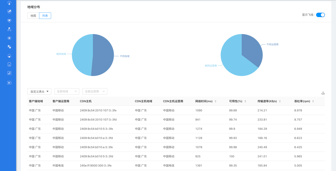 基于核心技術(shù),自動(dòng)識(shí)別 CDN 廠商信息,提供詳細(xì)的 CDN 節(jié)點(diǎn)分布并支持全局過(guò)濾,通過(guò)網(wǎng)絡(luò)時(shí)間、可用性和下載速率綜合評(píng)估 CDN 質(zhì)量,助力運(yùn)維人員了解 CDN 節(jié)點(diǎn)分布、匹配策略和綜合質(zhì)量。
