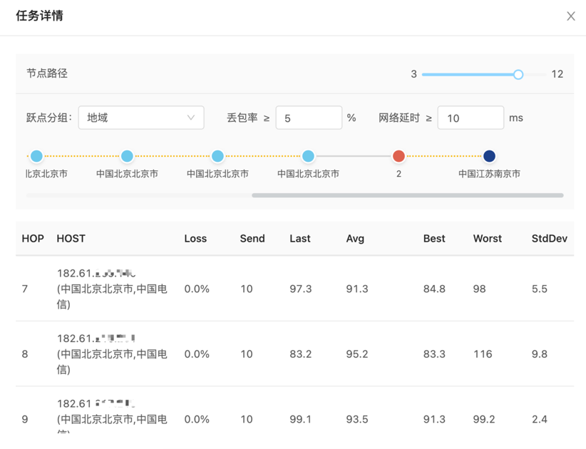通過(guò)探測(cè)應(yīng)用使用過(guò)程中的網(wǎng)絡(luò)波動(dòng),提供網(wǎng)絡(luò)延時(shí)和丟包率兩大核心指標(biāo),讓運(yùn)維人員能夠區(qū)分判別客戶(hù)端網(wǎng)絡(luò)環(huán)境較差導(dǎo)致的網(wǎng)絡(luò)錯(cuò)誤。