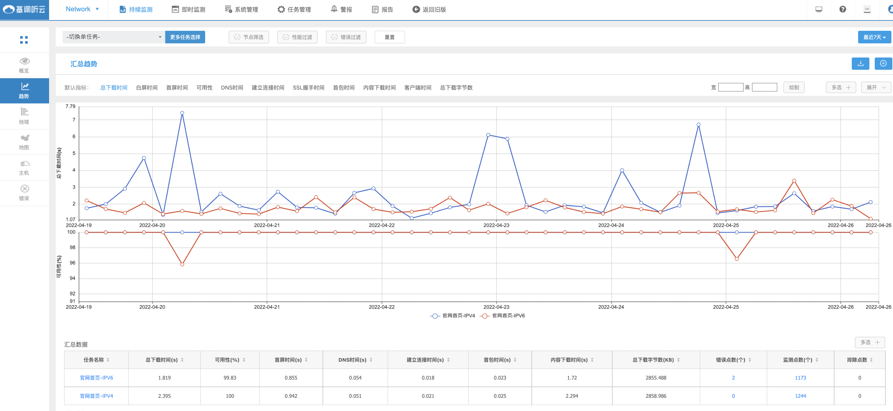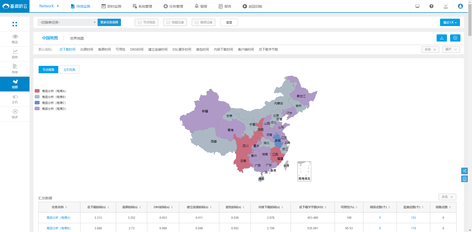 基調(diào)聽(tīng)云Network可通過(guò)撥測(cè)方式對(duì)網(wǎng)站頁(yè)面、接口、業(yè)務(wù)流程、網(wǎng)絡(luò)鏈路、CDN節(jié)點(diǎn)的可用性及性能進(jìn)行監(jiān)測(cè),以及提供基于用戶體驗(yàn)和性能維度的競(jìng)品分析數(shù)據(jù)。